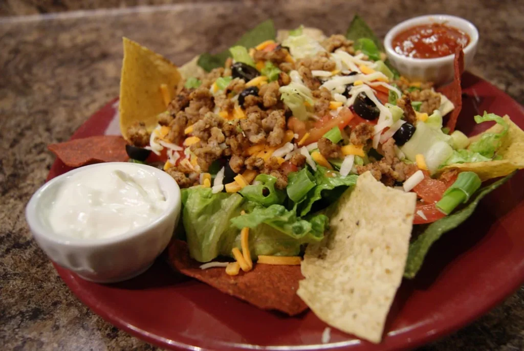 Mix of salsa and pizza sauce, taco beef, mushroom, onion, green peppers, olives, jalapeño, taco chips, cheddar, mozzarella cheese, served with sour cream